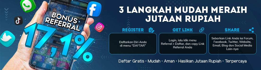 Referral system tidak dipungut biaya apapun. Hanya dengan modal online saja setelah itu Anda hanya tinggal mengecek keuntungan Anda yang dapat dilihat secara online kapanpun dan dimanapun. Register sekarang juga dan referensikan Link Referral Anda